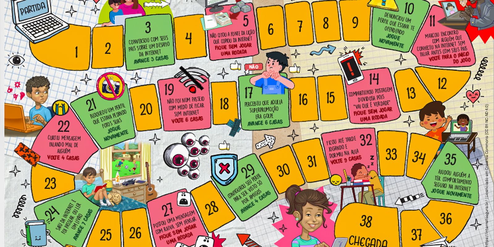 Para brincar, é preciso baixar e imprimir o material, que está disponível no site da Internet Segura, e então recortar e montar um dado e alguns personagens disponíveis no jogo. Depois, basta jogar esse dado e ir pulando as casas correspondentes até chegar ao destino final. Se, no caminho, você cair em uma casa de comportamento arriscado na internet, terá que voltar uma casa ou ficar sem jogar. Ganha o jogo quem tiver um comportamento mais seguro na internet e conseguir chegar primeiro ao ponto final.